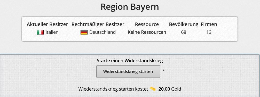 Der Widerstandkrieg (kurz RW für Resistance War) kann von jedem Bürger zu den Kosten von 20 Gold gestartet werden mit dem Ziel, eine feindlich besetzte eigene Region wieder freizukämpfen. Um einen Widerstandskrieg zu starten, müssen folgende Schritte gemacht werden: