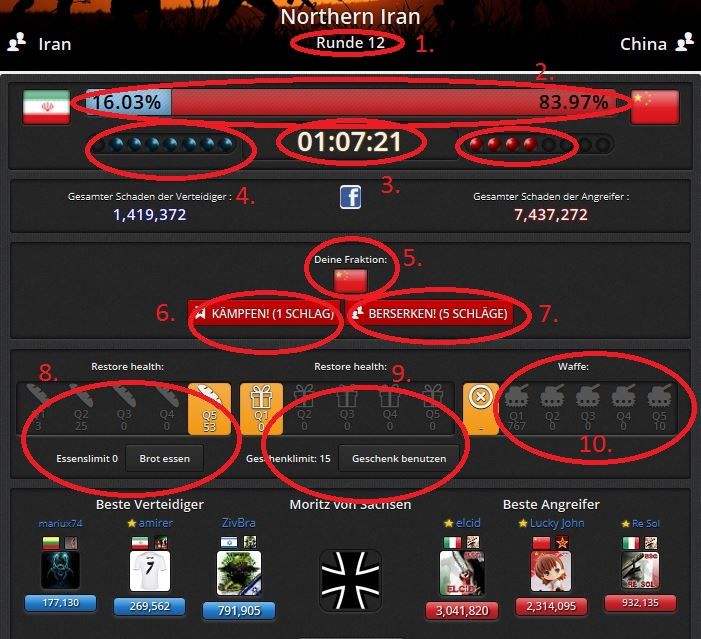 Dort sieht man die Rundenzahl (1), in der sich die Schlacht befindet, das aktuelle Kräfteverhältnis (2) der beiden Kriegsgegner und ihrer Verbündeten (mehr als 50% für die eigene Seite ist gut!), die Restzeit (3), also wie lange die aktuelle Kampfrunde noch läuft, dann die Anzahl der gewonnenen Kämpfe (4) von jeder Seite. Es wird angezeigt, für welche Fraktion (5), also für welches Land man kämpft. Weiter kann ausgewählt werden, ob man nur mit einem Schlag (6) kämpft, oder als Berserker 5 Schläge (7) auf einmal abgibt. Der Berserker wird besonders gern verwendet, wenn man mit anderen Kämpfern gemeinsam koordiniert kurz vor Ende einer Runde zuschlägt, um den Gegner zu überraschen und eine drohende Niederlage abzuwenden.