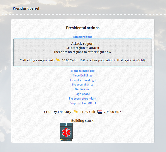 Activities in this game are divided into several modules. First is the economy as a citizen in a country of your choice you must work to earn money, which you will get to spend for example, on food or purchase of weapons which are critical for your progress as a fighter. You will work in either private companies which are owned by players or government companies which are owned by the state. After progressing in the game you will finally get the opportunity to set up your own business and hire other players. If it prospers, we can even change it into a joint-stock company and enter the stock market and get even more money in this way.